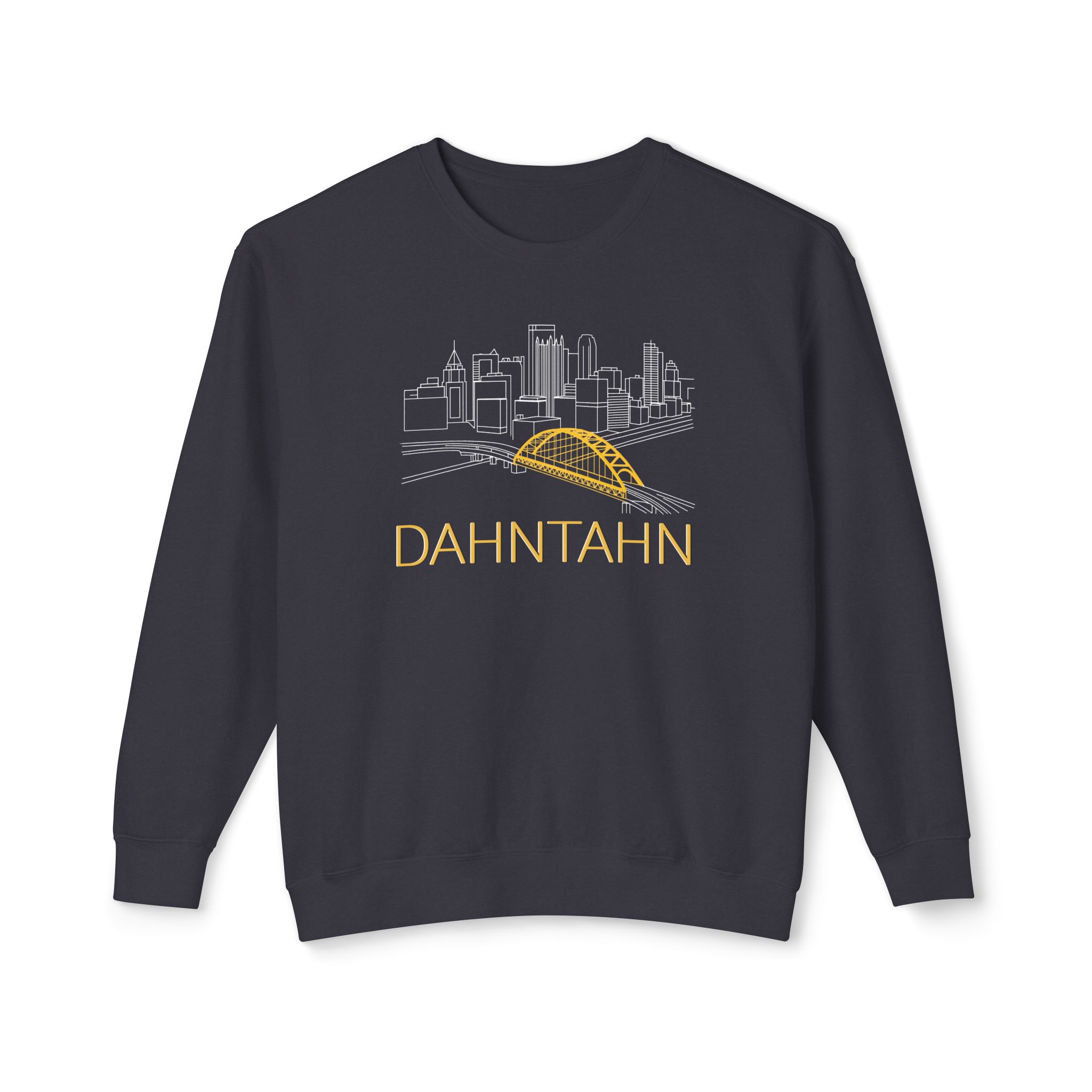 The design offers a classic stencil skyline of dahntahn Pittsburgh as seen from Mount Washington. Perfect for adults looking for a cozy, durable sweatshirt with a touch of personality. Ideal for casual wear or as a gift for birthdays, holidays, or special occasions.