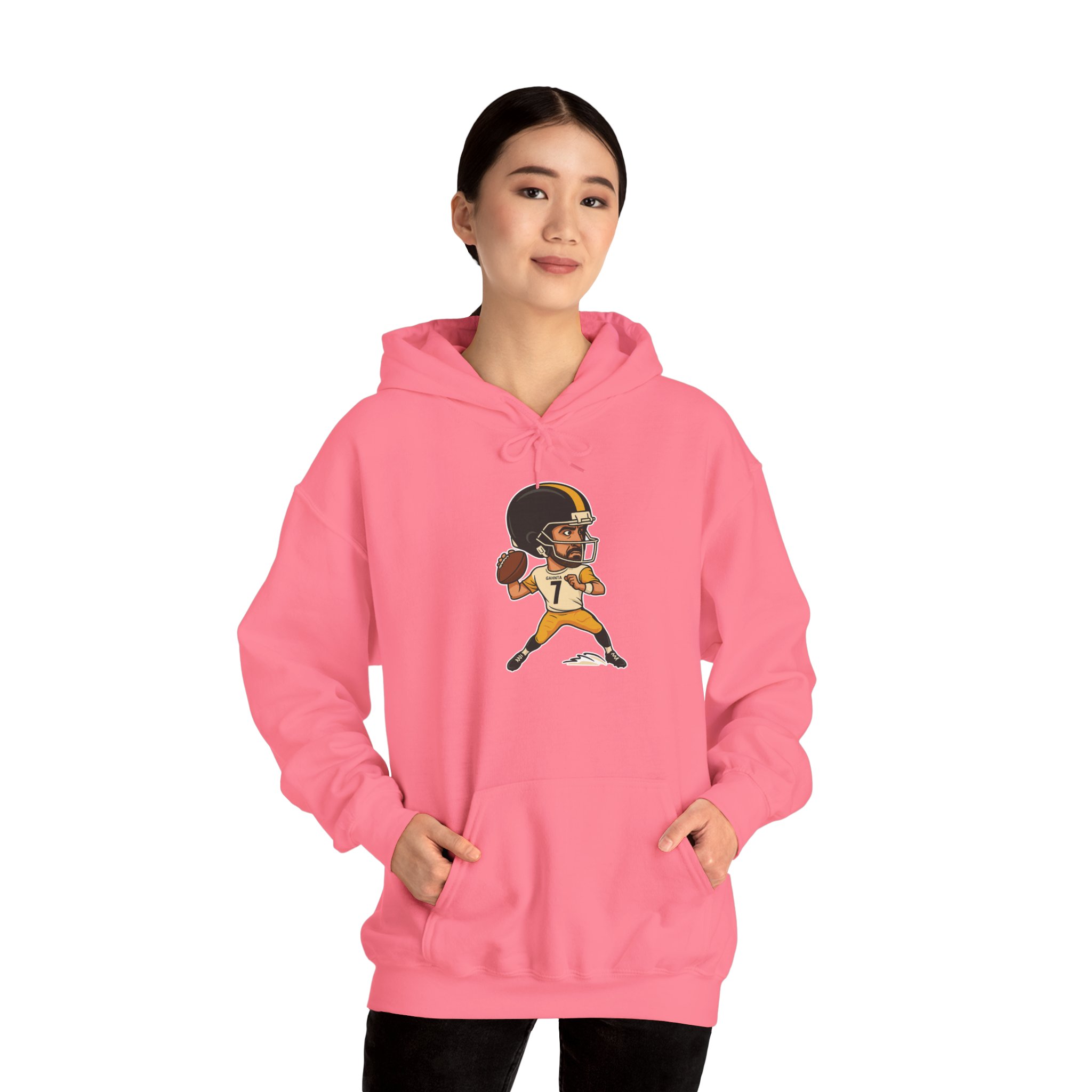 The GAHNTA AR Big Head Classic hoodie is the ultimate combination of comfort, durability, and Pittsburgh pride. Made from soft, midweight fabric, this hoodie keeps you cozy on chilly mornings, evening strolls, or while cheering on your favorite Pittsburgh sports team. A bold graphic of a beloved quarterback with an oversized helmet.